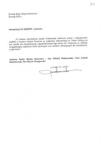 26 maja 2015 roku zwróciłem się z prośbą o zabezpieczenie środków w budżecie Miasta Rzeszowa na wykonanie dokumentacji dla Domu Kultury oraz kompleksowego zagospodarowania tego terenu (ul. Graniczna, ul. Zielona), uwzględniając wykonanie boisk sportowych oraz terenów rekreacyjnych dla mieszkańców, w tym dzieci. Ze względu na prace przy budowie filii RDK przy ul. Herbowej oraz rozbudowę domów kultury na Osiedlach Przybyszówka i Słocina, rozpatrzenie mojego wniosku zostało niestety odłożone na późniejszy termin.