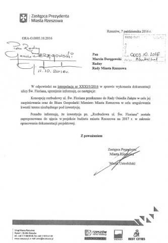 We wrześniu 2016 roku zwróciłem się z prośbą do Prezydenta o ujęcie w budżecie środków na wykonanie dokumentacji umożliwiającej budowę drogi publicznej przy ul. Św. Floriana. W odpowiedzi otrzymałem informację, że koncepcję rozbudowy ul. Św. Floriana przekazano do Rady Osiedla Załęże w celu jej zaopiniowania oraz do Biura Gospodarki Mieniem Miasta Rzeszowa w celu uregulowania kwestii terenu niezbędnego pod inwestycję. Inwestycja pn. „Rozbudowa ul. Św. Floriana” została też zaproponowana do ujęcia w projekcie budżetu miasta Rzeszowa na 2017 r. w zakresie opracowania dokumentacji projektowej.
